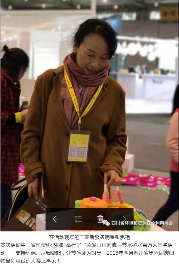 资源是有限的,我们要把有限的资源无限循环;我们倡导废物二次利用、节水护水!由四川省环境和资源综合利用协会主办的四川省第五届“万基杯”废旧物品创意设计大赛,2017年11月10-13日在新会展中心2号馆举行,本次大赛得到了成都市人民政府和职能部门及社会各界的大力支持!作品展示受到现场观众的追捧,大家为作品的精细做工、美观实用点赞,参展参赛单位有往届的最佳支持单位四川国际标榜职业学院、川大华西附属医院和附属口腔上医院等院校,也迎来第一次参加的成都监狱、西南石油大学、北大成都附属实验学校、郫都区红光思源学校、资阳市车城幼儿园等院校;本次活动还吸引了社会团体不少社区居民来参展,其中桂溪天华社区冯邻玉、李玉兰、陈正虹送来了利用废弃油桶做的滤水架、饮料瓶变小水杯、旧衣服制鞋垫等。活动中我们接待了成都信息工程大学、四川文化产业职业学院、成都大学、成都理工大学、四川师范大学、四川旅游学院、建设路小学、省农科院幼儿园等院校师生和家长,他们纷纷表示明年四月举办第六届废旧物品创意设计大赛时一定要来参加。