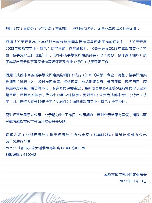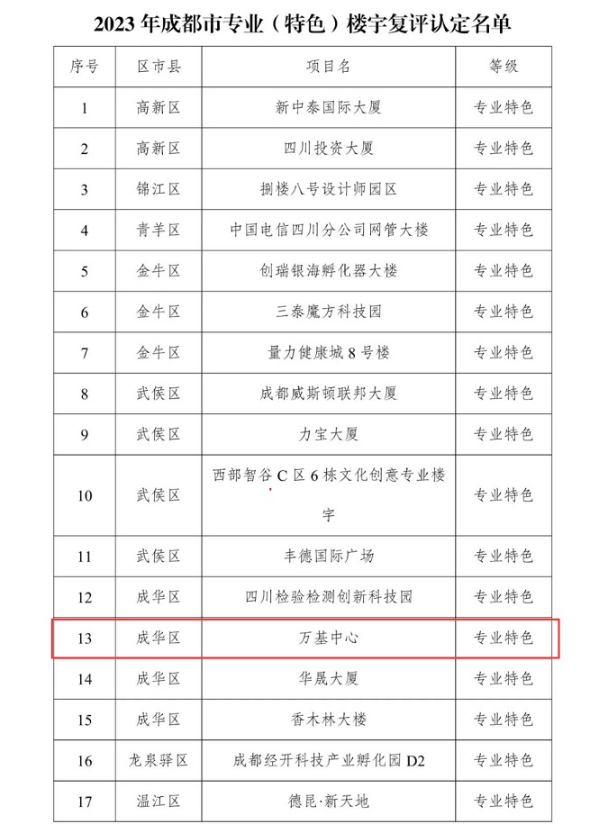 热烈祝贺万基中心通过2023专业特色楼宇的认定,根据成都楼宇经济报道《关于2023年成都市商务楼宇国家标准等级及专业(特色)楼宇评定结果的公示》中,成都成华区万基中心登陆2023年成都市专业(特色)楼宇复评认定名单。