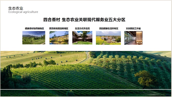 四合香村项目整合130000余平米的生态农业建设, 专门用于生态种植示范 、植物乐园, 生态趣味农场的打造, 增加项目亮点的同时供应项目配套健 康美食及市场所需要的生态健康食材。