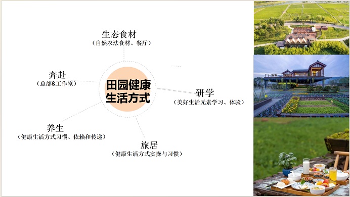 得益于四川盆地郫都区红光社区良好的种植条件,项目农地区域将种植1000多种多样性生态农作物,涵盖了日常蔬果类食材的大部分品种 ,为整个项目的配套健康 美食、素质教育研学交流、康养康居消费提供从育苗到耕种过程的田园美学生产实 践 ,消费者可以近距离观看自然农法的种植和管养方式;既可以直接购买新鲜食材, 也可以在美食营养餐厅区品尝到使用生态农产品制作的营养美食。